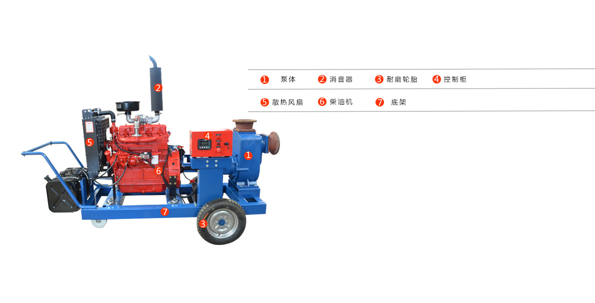 2.手推式強自吸移動泵車主要由真空輔助裝置、柴油機動力包、柴油機專用油箱、泵傳動系統(tǒng)、設備底座、自吸泵總成、防雨設施、起動裝置、起動電源裝置、進水管總成、出水管總成、二輪移動拖車系統(tǒng)、快速起吊裝置等組成。